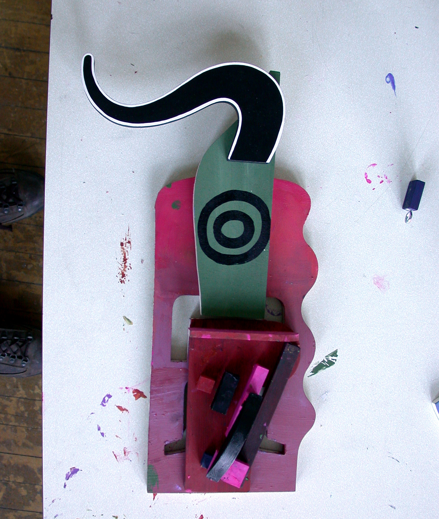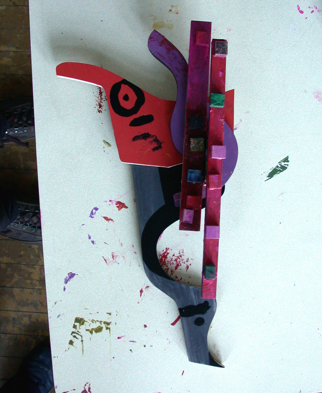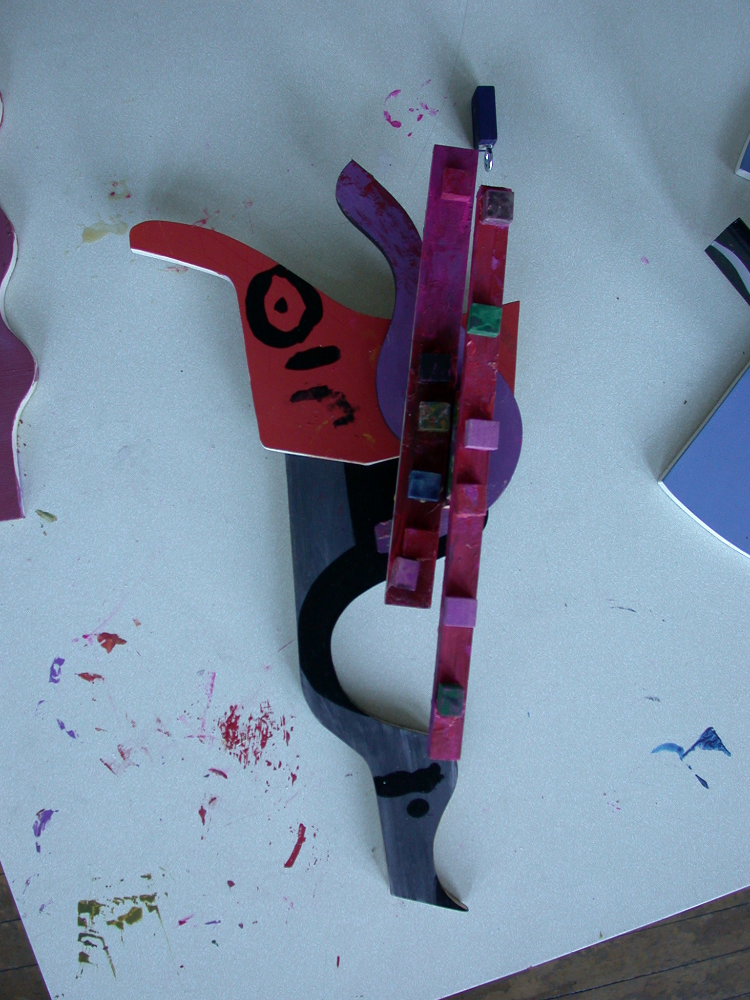 Les premières couches de couleur peinte sur les découpes en bois, ne devraient pas être définitives. Elles devront permettre une ré intervention pictural de leurs surfaces, une fois les sculptures assemblées. Ces formes donc devront être peintes, de façons à s’intégrer à un ensemble de pièces, qui composeront les sculptures.