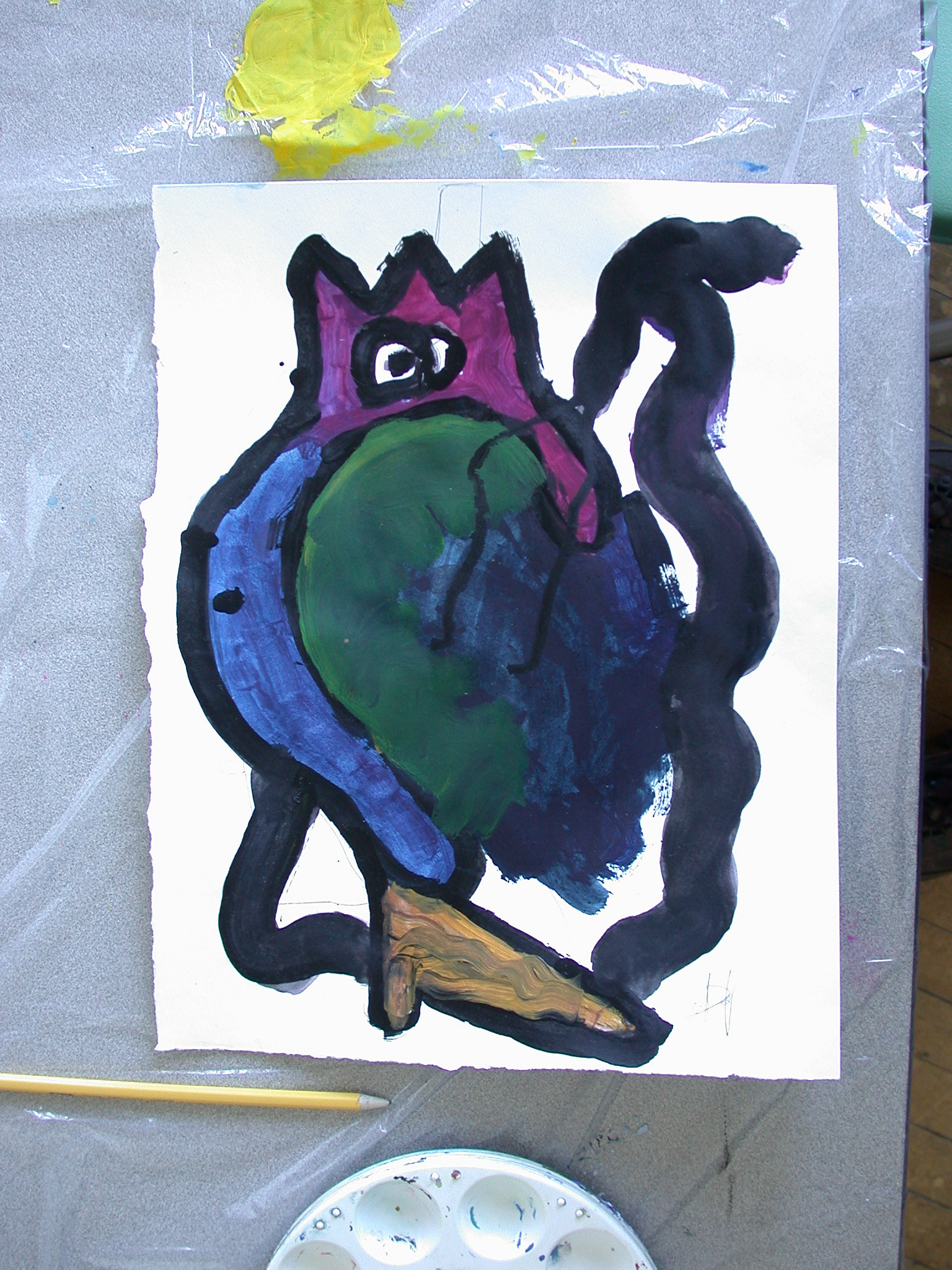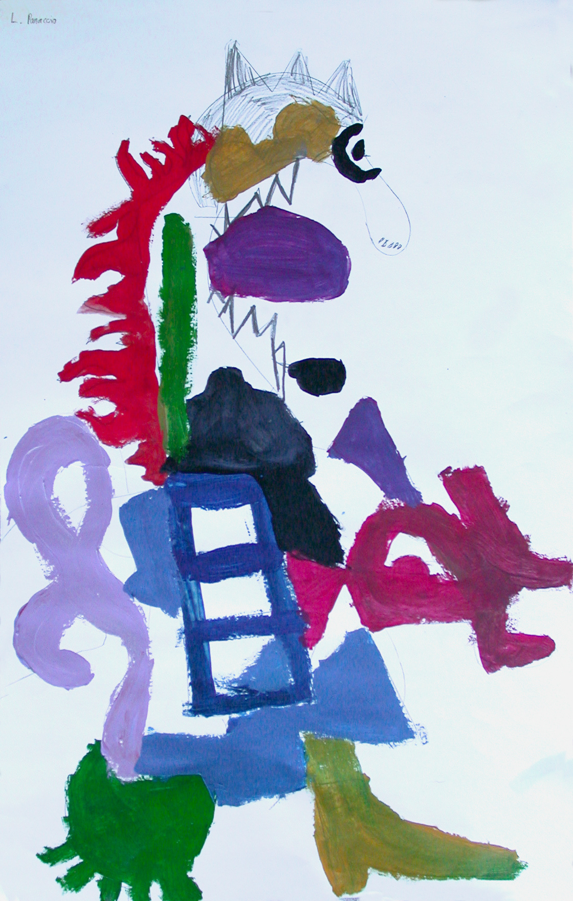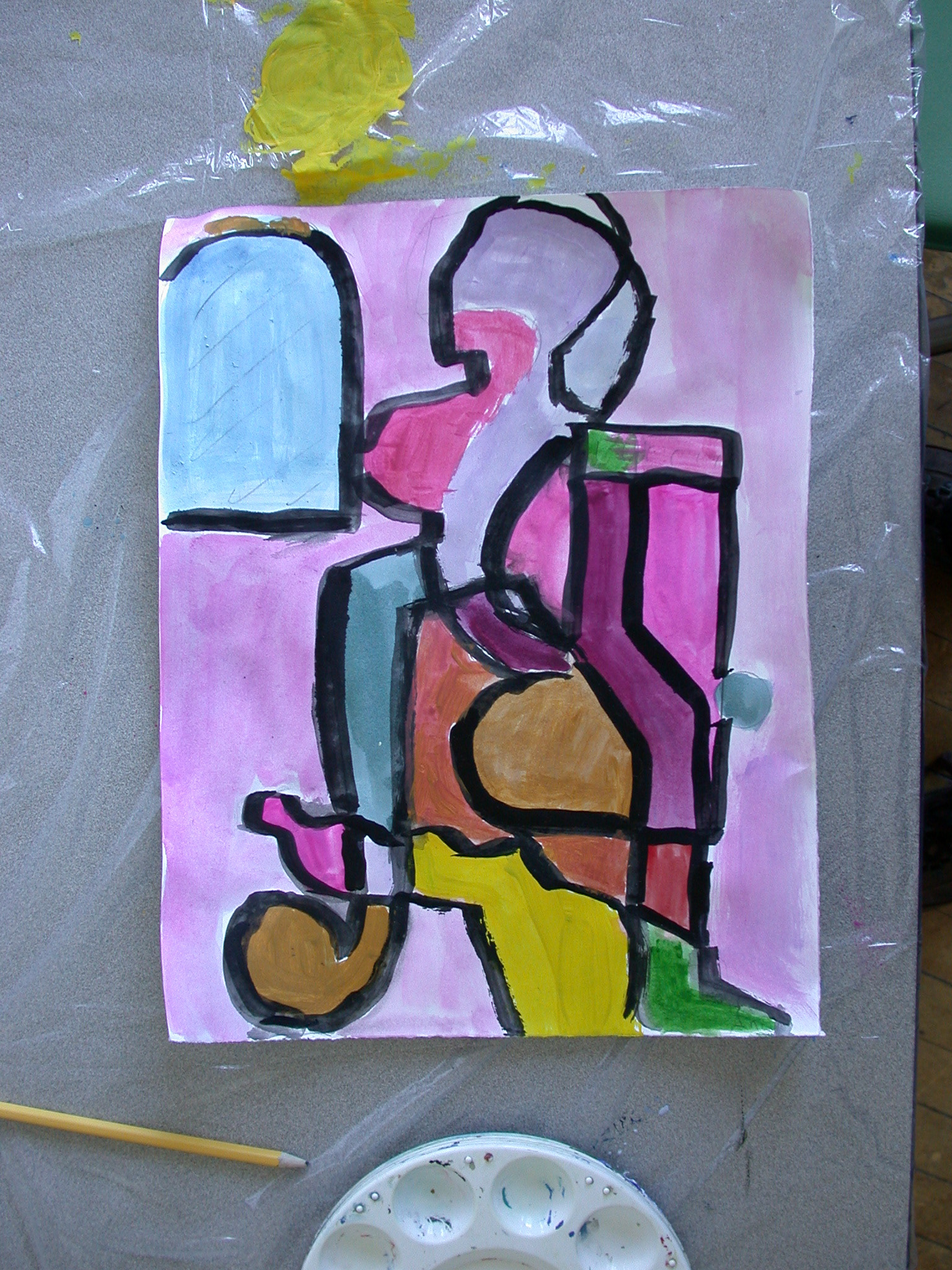 Les premières couches de couleur peinte sur les découpes en bois, ne devraient pas être définitives. Elles devront permettre une ré intervention pictural de leurs surfaces, une fois les sculptures assemblées. Ces formes donc devront être peintes, de façons à s’intégrer à un ensemble de pièces, qui composeront les sculptures.