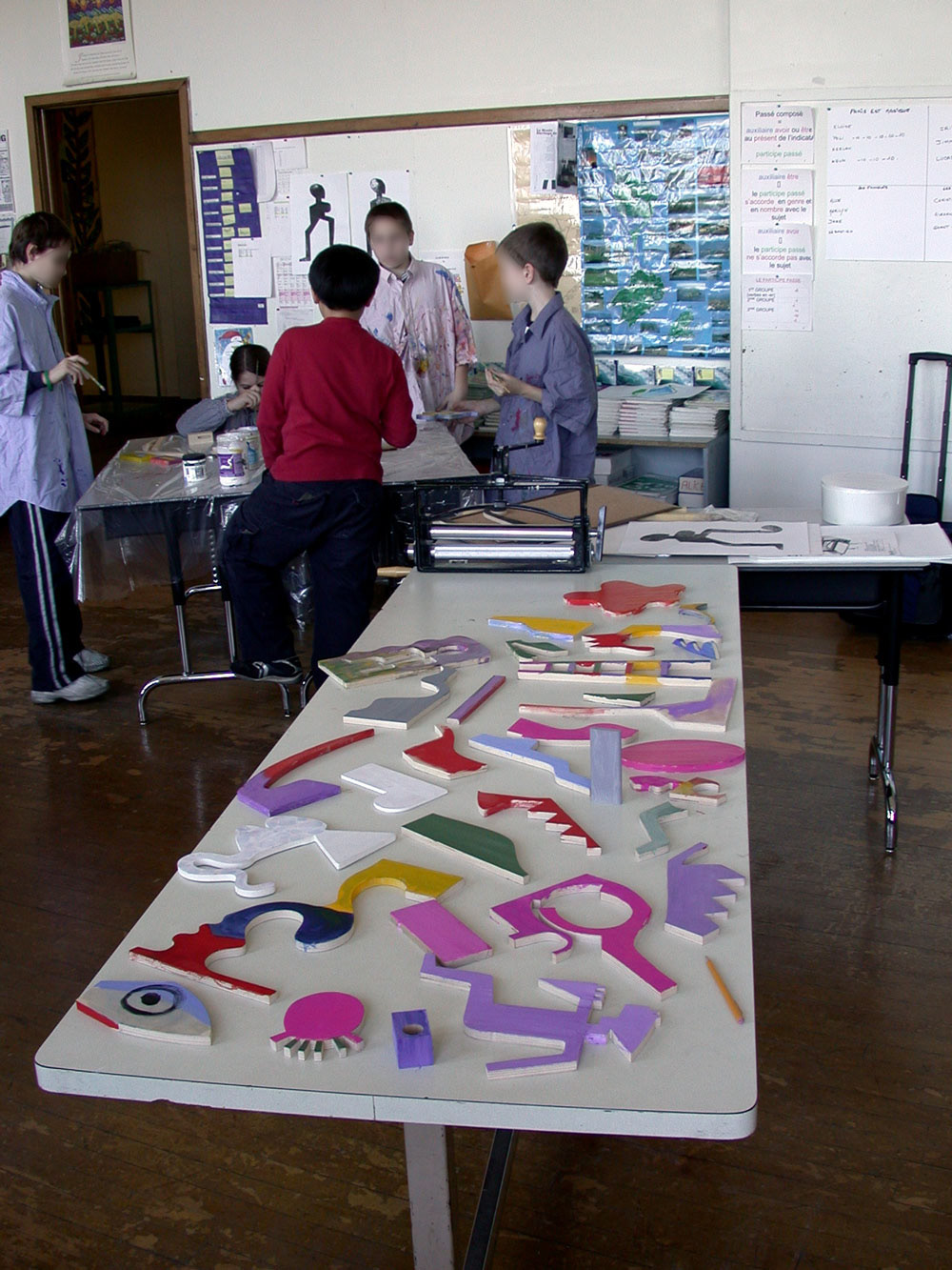 Après avoir étalé les formes de bois sur les tables comme si on en faisait l’inventaire, nous les examinerons et les classerons. Plus tard nous les tracerons, les peindrons, les collerons, les couperons au besoin. Et à partir de formes apparemment insignifiantes, dans la magie de la création, nous leur donnerons un sens.
