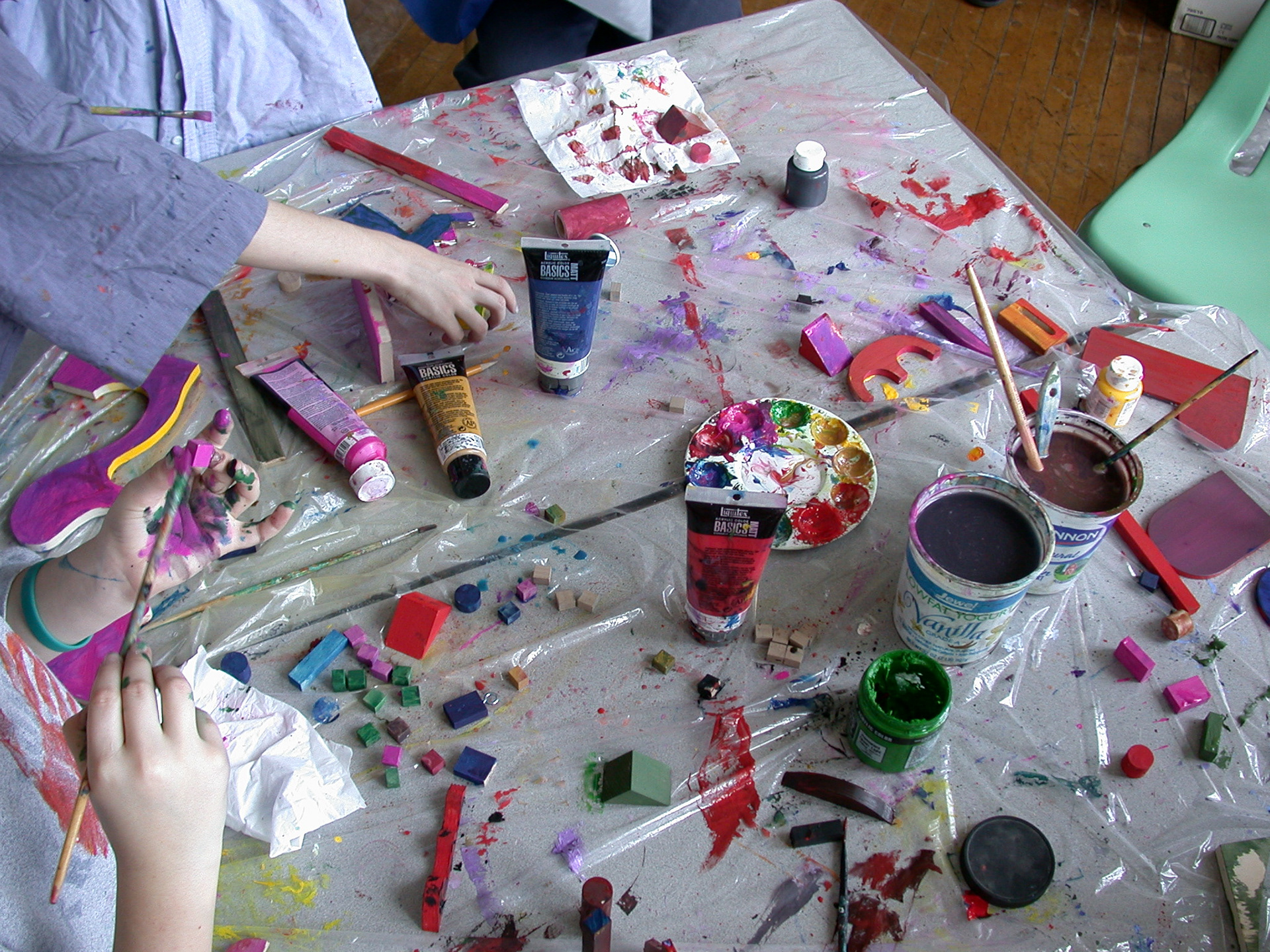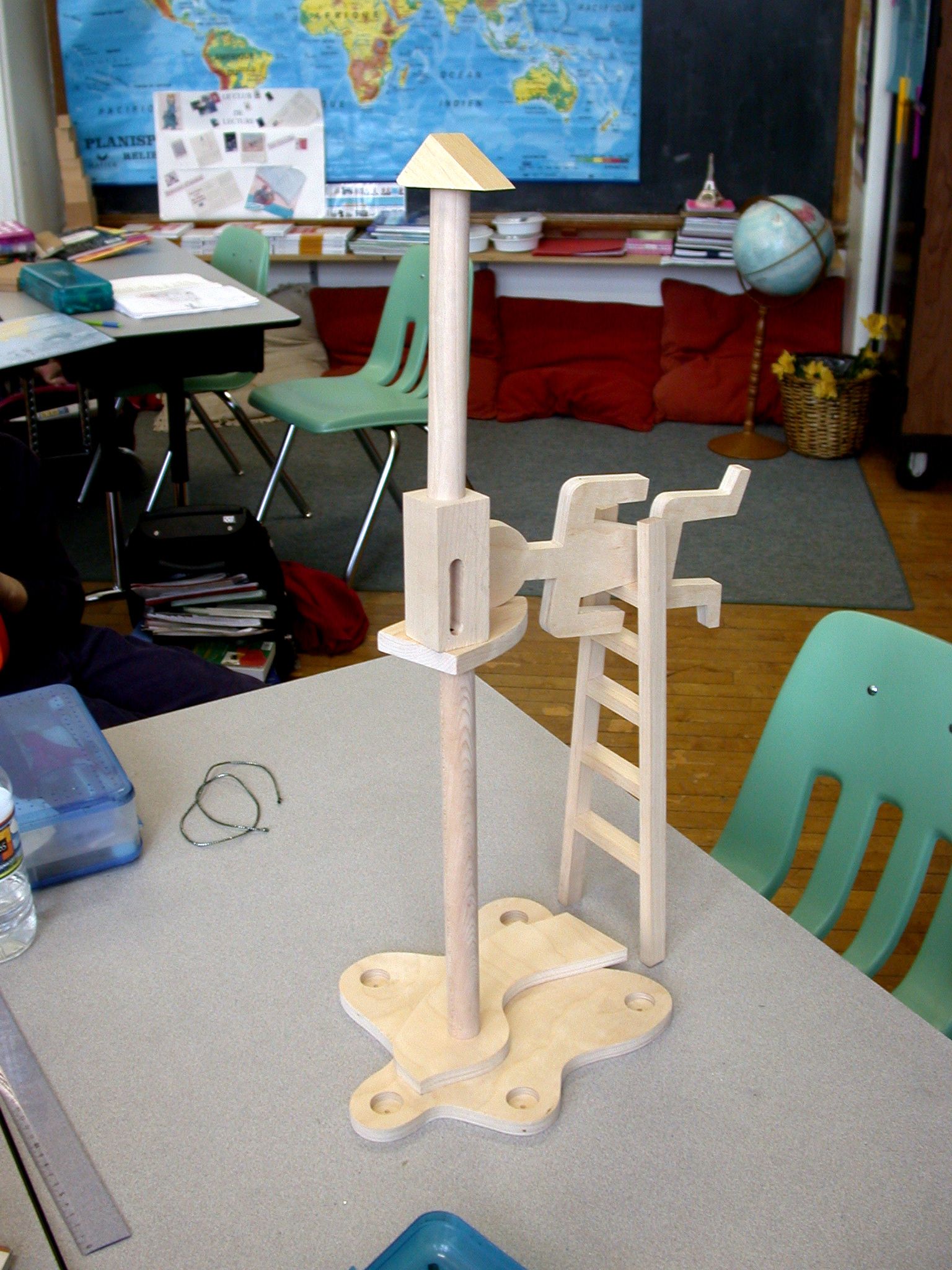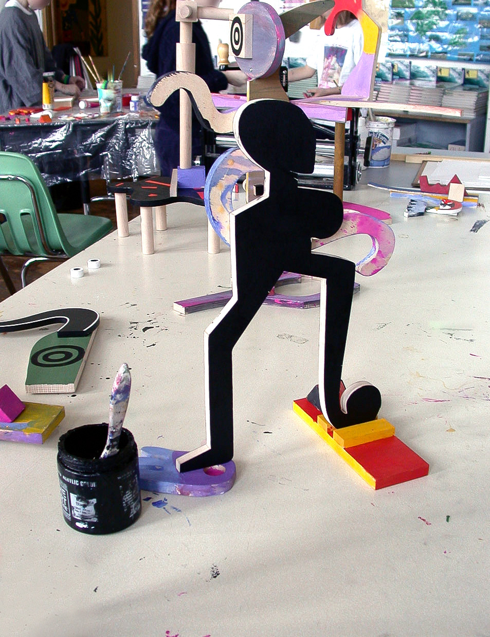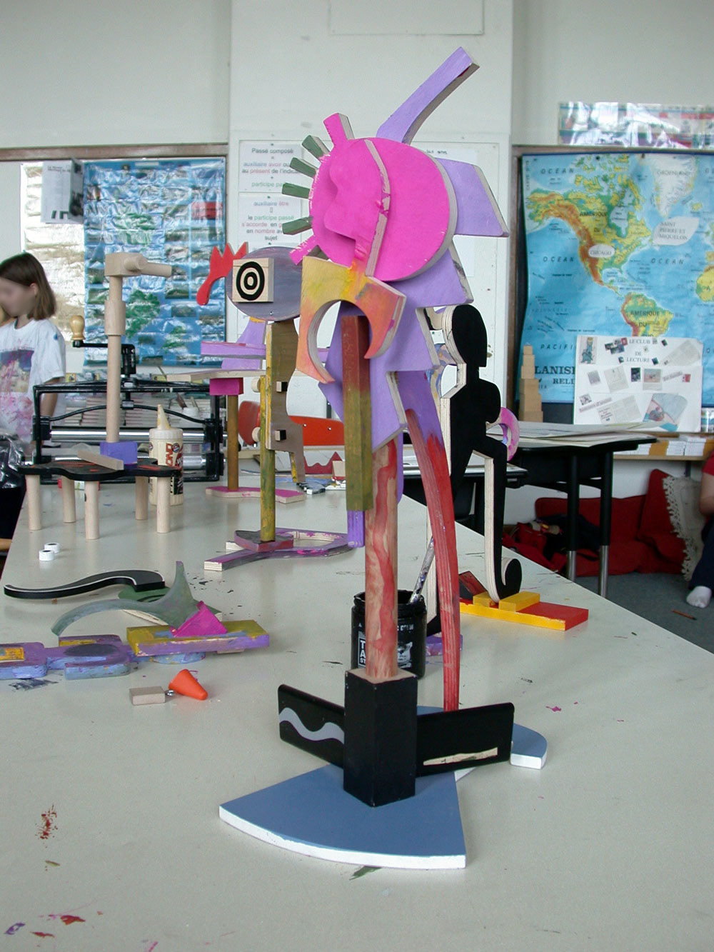 Une fois les formes peintes, nous aborderons les jeux d'assemblages, avec leurs multiples combinaisons. Comment faire tenir les formes? Comment donner l'illusion d'un personnage? Comment rendre une impression architecturale? C'est à cette étape et avec ces questionnements, que nos sculptures vont prendre forme et occuper l’espace. Ils suggèreront une histoire, une idée, une amusante construction. Par cette façon de faire à saveur d’aventure, nous fabriquerons, à partir de découpe en bois et de couleur, un petit monde bien fascinant.